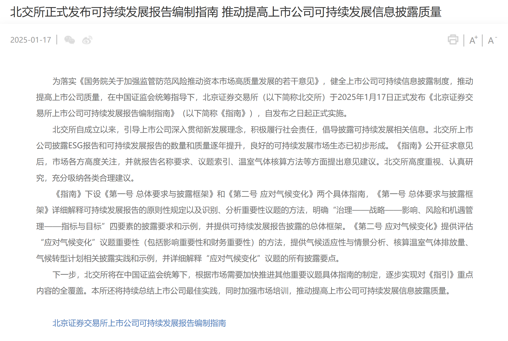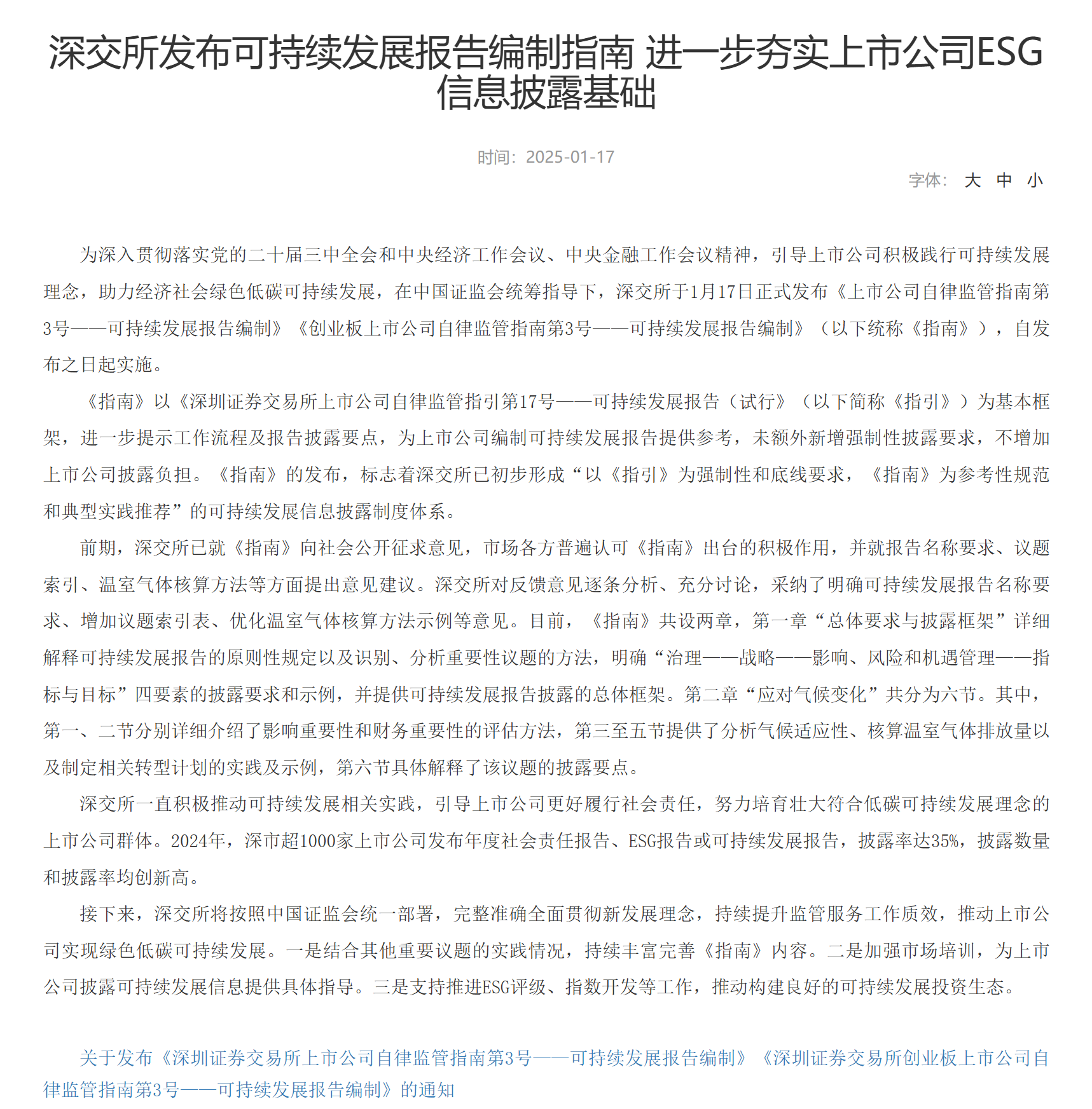 1月17日消息,為深入貫徹落實黨的二十屆三中全會和中央經濟工作會議、中央金融工作會議精神,引導上市公司積極踐行可持續(xù)發(fā)展理念,助力經濟社會綠色低碳可持續(xù)發(fā)展,在中國證監(jiān)會統(tǒng)籌指導下,滬深北交易所正式發(fā)布《上海證券交易所上市公司自律監(jiān)管指南第4號——可持續(xù)發(fā)展報告編制》《上海證券交易所科創(chuàng)板上市公司自律監(jiān)管指南第13號——可持續(xù)發(fā)展報告編制》;《深圳證券交易所上市公司自律監(jiān)管指南第3號——可持續(xù)發(fā)展報告編制》《深圳證券交易所創(chuàng)業(yè)板上市公司自律監(jiān)管指南第3號——可持續(xù)發(fā)展報告編制》;《北京證券交易所上市公司可持續(xù)發(fā)展報告編制指南》(以下統(tǒng)稱《指南》),自發(fā)布之日起實施。