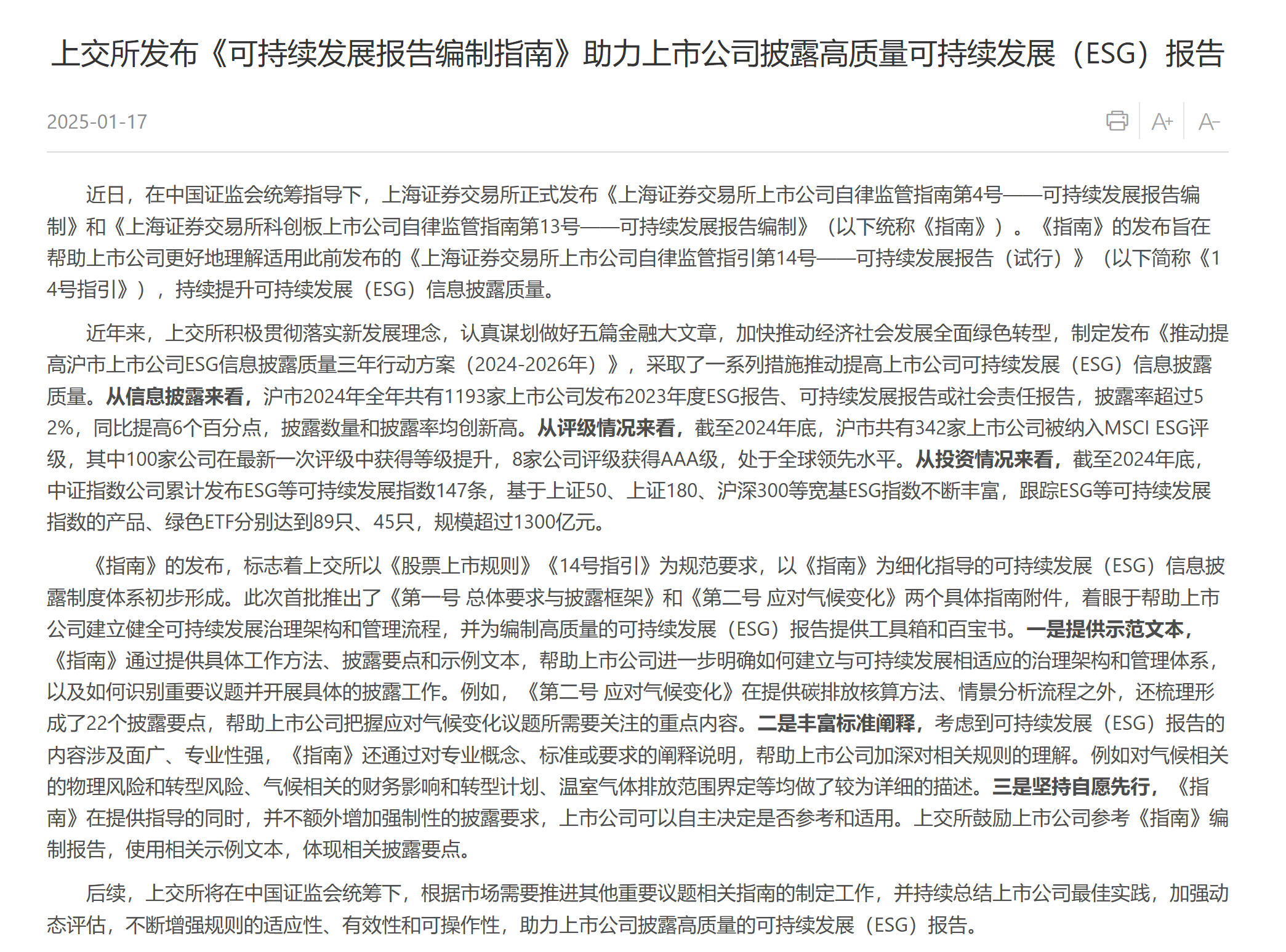 《指南》的發(fā)布,標志著三大交易所已初步形成“以《指引》為強制性和底線要求,《指南》為參考性規(guī)范和典型實踐推薦”的可持續(xù)發(fā)展信息披露制度體系。