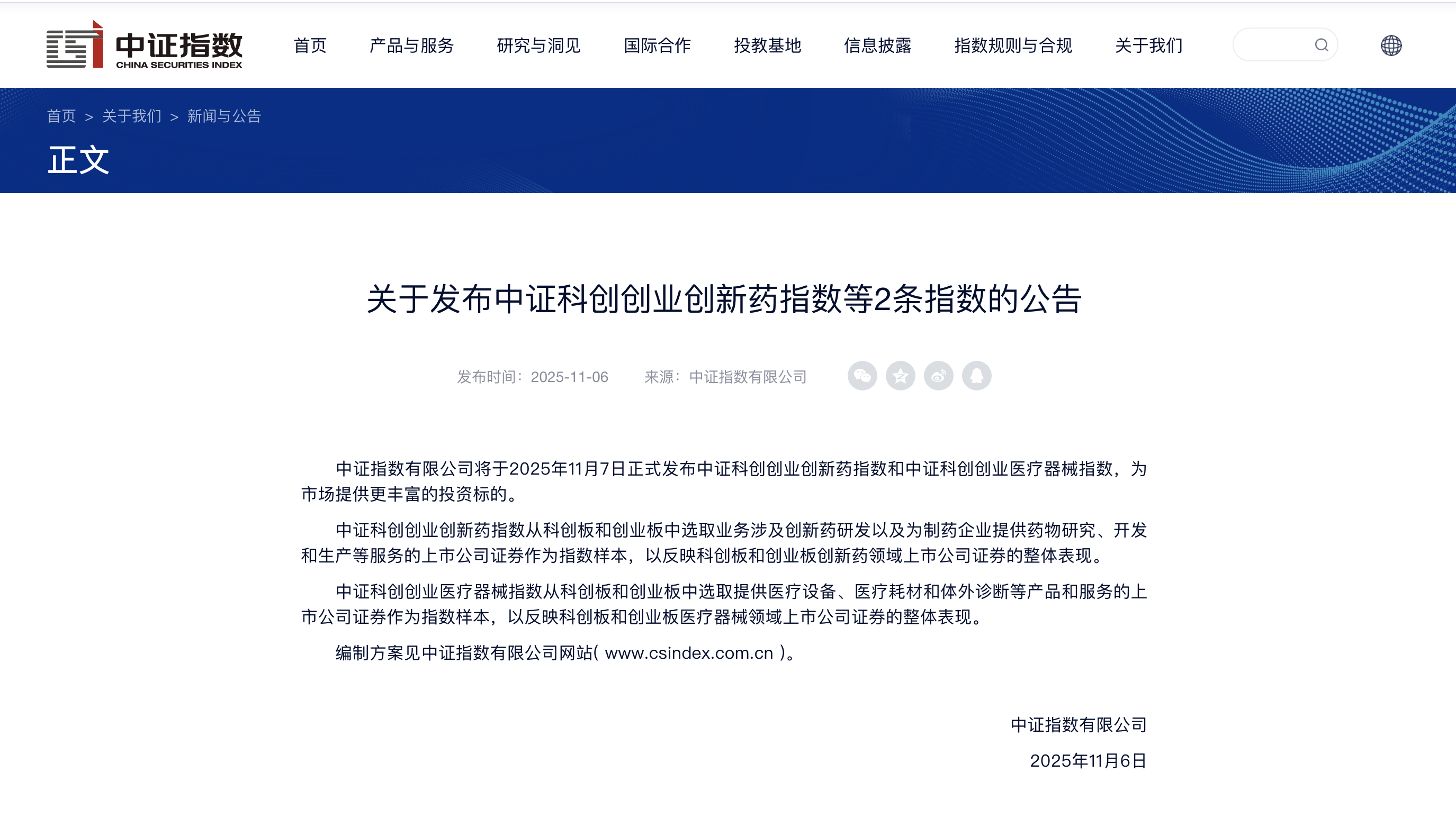 本報訊 (記者毛藝融)11月6日,中證指數(shù)有限公司公告稱,將于2025年11月7日正式發(fā)布中證科創(chuàng)創(chuàng)業(yè)創(chuàng)新藥指數(shù)和中證科創(chuàng)創(chuàng)業(yè)醫(yī)療器械指數(shù),為市場提供更豐富的投資標的。