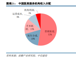 在整個醫(yī)美產(chǎn)業(yè)鏈中,上游的器械、耗材監(jiān)管和技術(shù)壁壘高,壟斷性較強,因此帶來較高的利潤率,但上游產(chǎn)業(yè)在整個醫(yī)美產(chǎn)業(yè)鏈中的收入分配比例較小。中信建投數(shù)據(jù)顯示,下游醫(yī)美機構(gòu)的毛利率可達50%~60%,但營銷部分分走了大部分利潤,中游獲客渠道,是產(chǎn)業(yè)鏈中分配比例最高的部分。