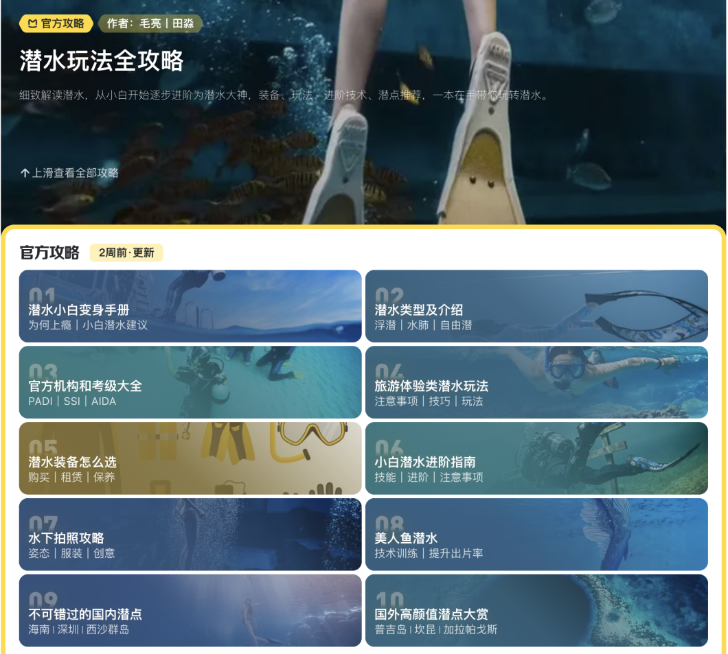 “北極星攻略”是馬蜂窩推出的一站式系統(tǒng)化旅游攻略,用全面、及時(shí)和準(zhǔn)確的信息解決游客旅行前后關(guān)心的問(wèn)題,并且用精選思維進(jìn)行旅行玩樂(lè)產(chǎn)品的篩選。馬蜂窩的北極星攻略也專(zhuān)門(mén)為潛水、滑雪、馬拉松等運(yùn)動(dòng)項(xiàng)目建立了專(zhuān)屬攻略,需要哪些準(zhǔn)備工作、國(guó)內(nèi)優(yōu)質(zhì)簽點(diǎn)、考證必備知識(shí)等實(shí)用信息一應(yīng)俱全,通過(guò)一站式信息島幫助游客輕松入門(mén)‘小眾’運(yùn)動(dòng)。
