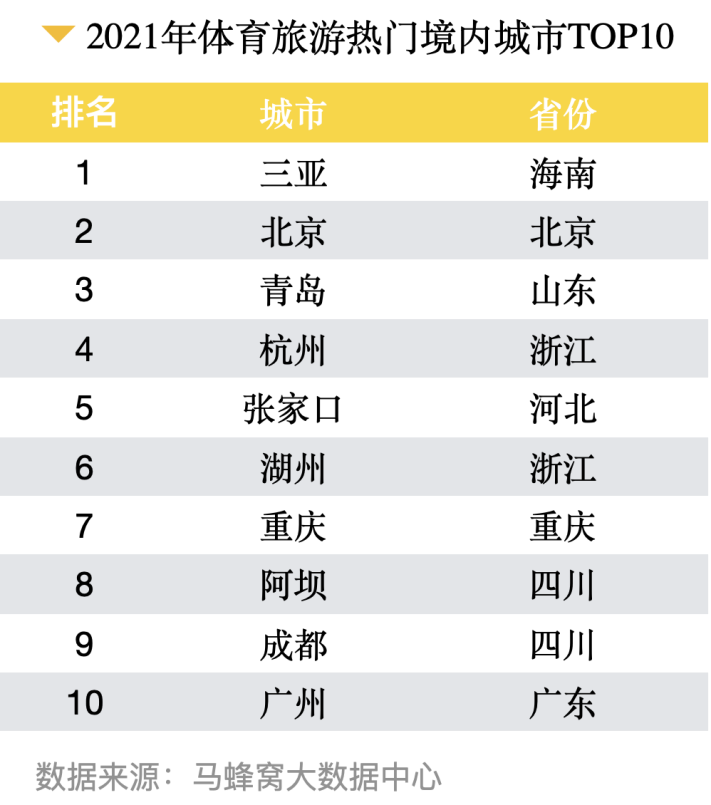 在2021年體育旅游熱門(mén)境內(nèi)城市Top10榜單上,因疫情導(dǎo)致的境外游受限,卻讓以往熱衷境外體育游人群紛紛將目光轉(zhuǎn)向境內(nèi)目的地,潛水、沖浪、浮潛、滑翔傘等曾經(jīng)的境外海島游熱門(mén)玩法,使三亞迅速躥升至境內(nèi)體育旅游熱門(mén)目的地Top1。北京憑借2022年冬奧會(huì)舉辦地的優(yōu)勢(shì)位列熱門(mén)城市第二名,青島則憑借帆船體驗(yàn)、出??慈章湮购zt、海釣等體育游樂(lè)項(xiàng)目位居第三,奧林匹克帆船中心、奧運(yùn)帆船博物館均是熱門(mén)景點(diǎn)。