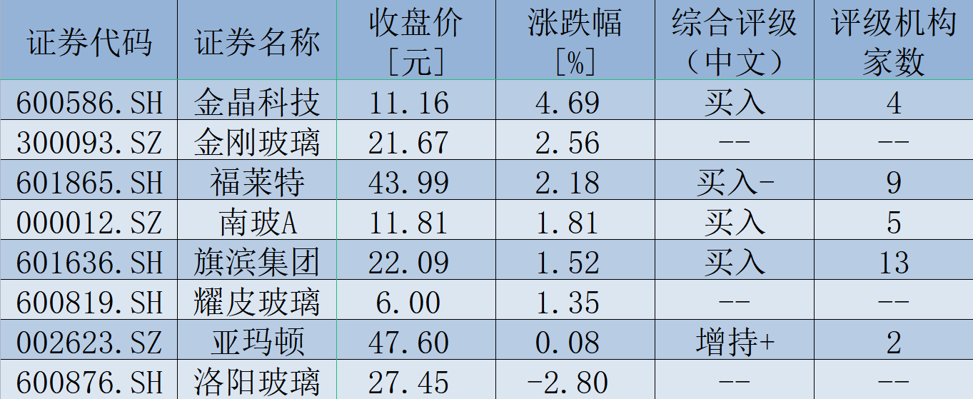值得一提的是,最近30日內,有5只玻璃制造板塊個股獲機構給予“買入”或“增持”等看好評級。其中,旗濱集團和福萊特分別獲得13次和9次看好評級,南玻A(5次)、金晶科技(4次)、亞瑪頓(2次)等3只個股也獲得了機構給予的看好評級。