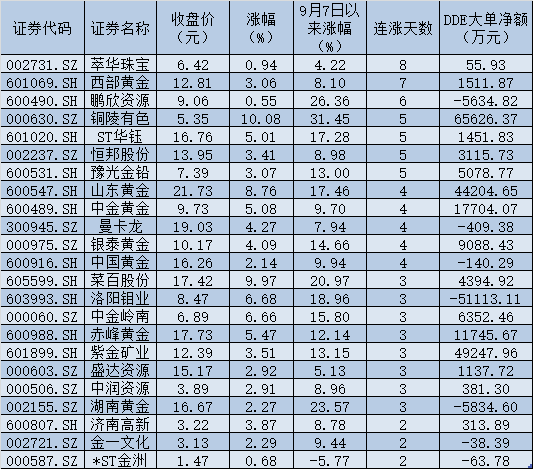 9月13日,除次新股菜百股份延續(xù)漲停外,白銀有色、銅陵有色、ST華鈺等個股也均以漲停價報收,此外,山東黃金、洛陽鉬業(yè)、中金嶺南、赤峰黃金、中金黃金等個股漲幅也均在5%以上。另據(jù)統(tǒng)計,萃華珠寶、西部黃金、鵬欣資源、銅陵有色、ST華鈺、恒邦股份、豫光金鉛等7只個股連漲5天及以上。