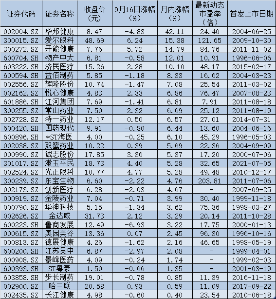 在9月份以來的這波反彈中,醫(yī)美股的分化趨勢已有所體現(xiàn),期間有31只醫(yī)美概念股呈現(xiàn)不同程度的上漲,占行業(yè)內(nèi)成份股比例為60.78%,華邦健康、愛爾眼科、開能健康、物產(chǎn)中大、濟民醫(yī)療等個股期間累計漲幅均在10%以上。反觀出現(xiàn)下跌的個股,超半數(shù)最新動態(tài)市盈率在50倍以上,國際醫(yī)學(xué)、愛美客、貝泰妮、華熙生物等4只個股最新動態(tài)市盈率均高于100倍。