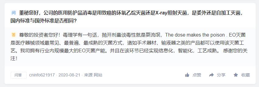 事實上,早在去年防疫物資大規(guī)模生產(chǎn)的時候,就有用戶向口罩生產(chǎn)商提出過類似問題:防護品消毒是用環(huán)氧乙烷滅菌還是X-ray照射滅菌?當(dāng)時,一家上市公司的答復(fù)也很幽默:“毒理學(xué)有一句話,拋開劑量談毒性就是耍流氓,EO(環(huán)氧乙烷)滅菌是醫(yī)療器械領(lǐng)域最常見、最普遍、最成熟的滅菌方式,諸如手術(shù)器材、輸液器之類的產(chǎn)品都可以使用該滅菌工藝。”