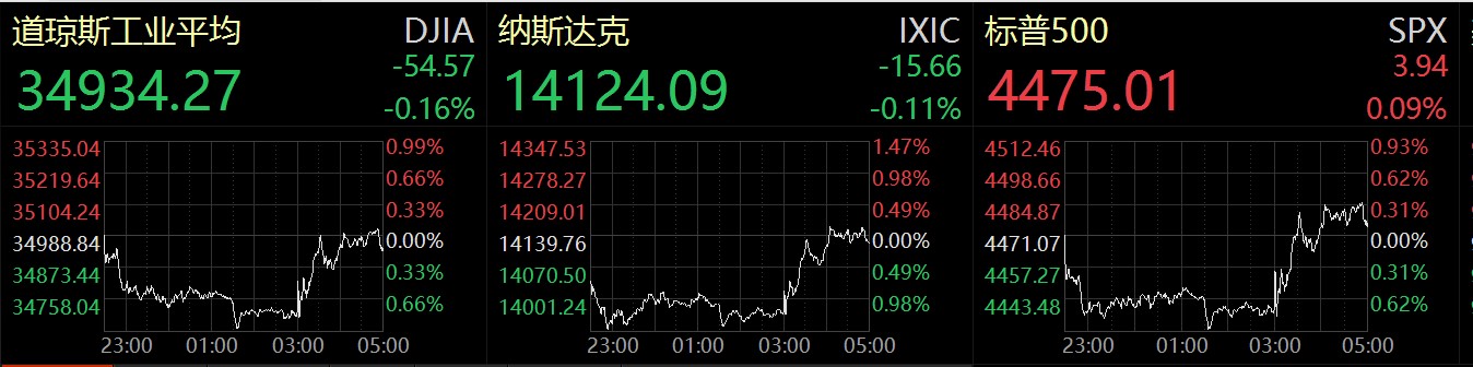 分析人士普遍認(rèn)為,美聯(lián)儲最新會議紀(jì)要的立場并不如預(yù)期強(qiáng)硬。受此消息影響,當(dāng)?shù)貢r間2月16日,美股三大指數(shù)盤中集體拉升,截至收盤,美股三大指數(shù)漲跌不一,道瓊斯指數(shù)跌0.16%,報34934.27點(diǎn);標(biāo)普500指漲0.09%,報4475.01點(diǎn);納斯達(dá)克指數(shù)跌0.11%,報14124.09點(diǎn)。