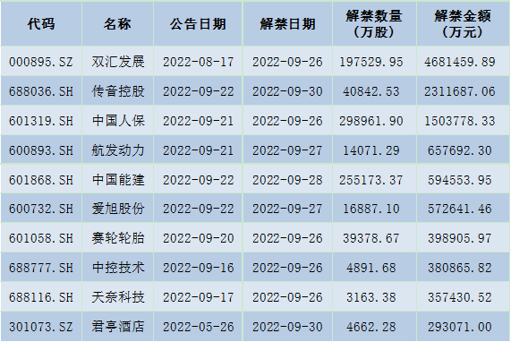 表:下周解禁金額前十位(本周收盤(pán)價(jià)計(jì)算)