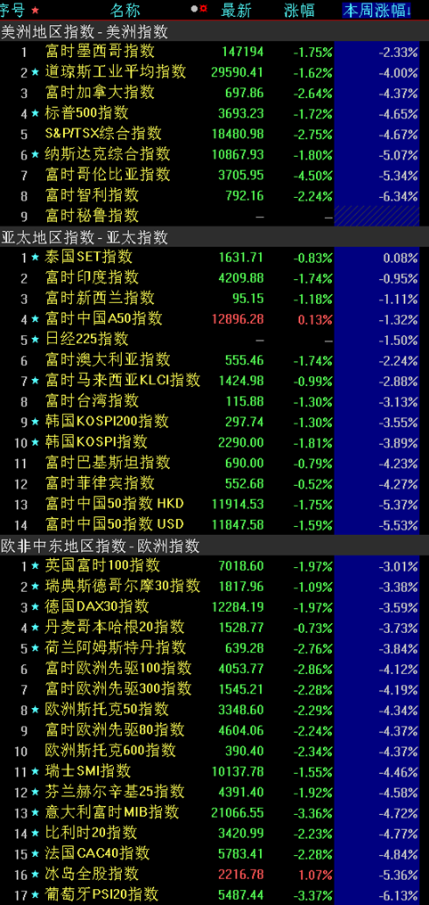 本周海外股市普遍回落。美股三大指數(shù)齊跌,道指周跌幅達(dá)4.00%;標(biāo)普500指數(shù)跌幅達(dá)4.65%;納指周跌幅達(dá)5.07%。歐洲方面,三大股指周線回落,英國(guó)富時(shí)100指數(shù)周跌3.01%,德國(guó)DAX30指數(shù)周跌3.59%,法國(guó)CAC40指數(shù)周跌4.84%。亞太股市,日經(jīng)225指數(shù)周跌1.50%;韓國(guó)KOSPI指數(shù)周跌3.89%。