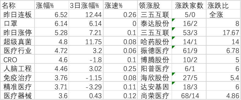 從板塊走勢來看,上午有61類板塊上漲,昨日連板(6.52%)、口罩(6.14%)、昨日漲停(5.28%)、超級真菌(4.8%)、醫(yī)療行業(yè)(4.72%)、CRO(4.6%)、人腦工程(4.46%)、免疫治療(3.76%)、精準醫(yī)療(3.71%)、醫(yī)療器械(3.6%)等板塊居漲幅榜前10位;有272類板塊下跌,旅游酒店(-5.68%)、工藝商品(-5.43%)、在線旅游(-5.41%)、裝修裝飾(-4.99%)、雞肉概念(-4.92%)、園林工程(-4.78%)、船舶制造(-4.65%)、賽馬概念(-4.58%)、白酒(-4.49%)、海南板塊(-4.32%)等板塊居跌幅榜前10位。