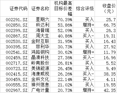 評級機構(gòu)對上述101家公司中的75家給予了推薦評級,占比74.26%。數(shù)據(jù)進一步顯示,有33家公司股票最新收盤價,較機構(gòu)推薦目標價還有差距,其中,有包括星期六(70.39%)、科達利(53.86%)、海普瑞(52.09%)等在內(nèi)的14只個股距機構(gòu)最高目標價還有超過20%的價差,值得投資者密切關(guān)注。