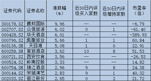 進一步梳理發(fā)現(xiàn),部分旅游餐飲股近30日內(nèi)均受到天風證券、東北證券等多家機構(gòu)看高一線。其中,中國國旅、首旅酒店、錦江酒店、中青旅、宋城演藝、峨眉山A等6只個股期間均受到券商10次及以上給予“買入”或“增持”等看好評級,后市表現(xiàn)值得密切跟蹤。