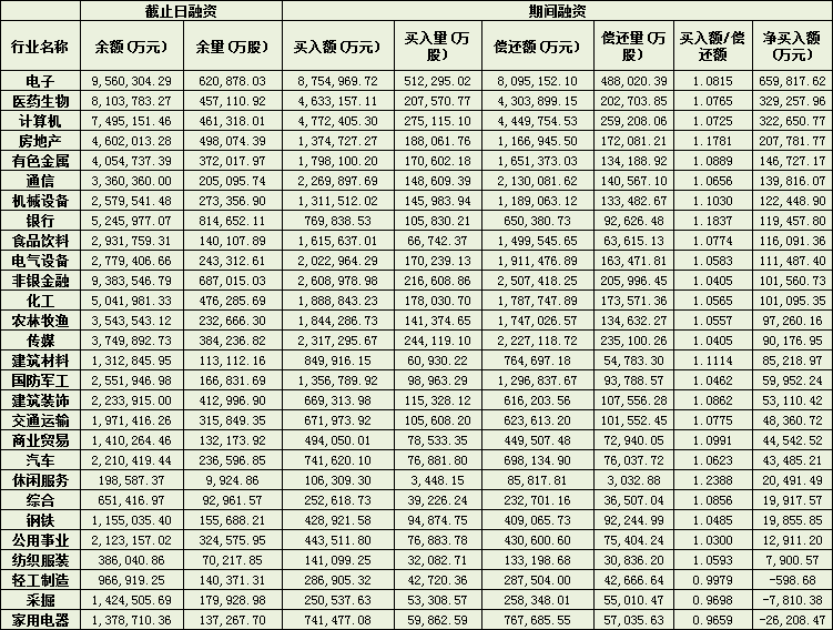 另外,房地產(chǎn)、有色金屬、通信和機(jī)械設(shè)備等行業(yè)融資凈買入額也均在12億元以上。僅有輕工制造、采掘和家用電器等三行業(yè)被融資客減持。
