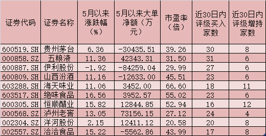 此外,通過梳理包括光大證券、東莞證券等在內(nèi)的多家券商研報(bào)發(fā)現(xiàn),食品飲料行業(yè)內(nèi),貴州茅臺、五糧液、伊利股份、山西汾酒、海天味業(yè)、絕味食品、恒順醋業(yè)、瀘州老窖、洋河股份、洽洽食品等10只成份股近30日內(nèi)均受到機(jī)構(gòu)25次及以上給予“買入”或“增持”等看好評級,后市表現(xiàn)值得關(guān)注。