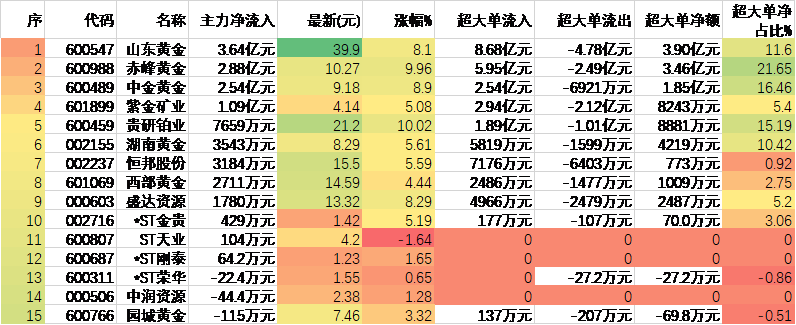 從資金流向來(lái)看,貴金屬板塊整體大單資金凈流入12.1億元,其中,山東黃金(3.64億元)、赤峰黃金(2.88億元)、中金黃金(2.54億元)、紫金礦業(yè)(1.09億元)等4只個(gè)股大單資金凈流入均超1億元,合計(jì)凈流入10.15億元。