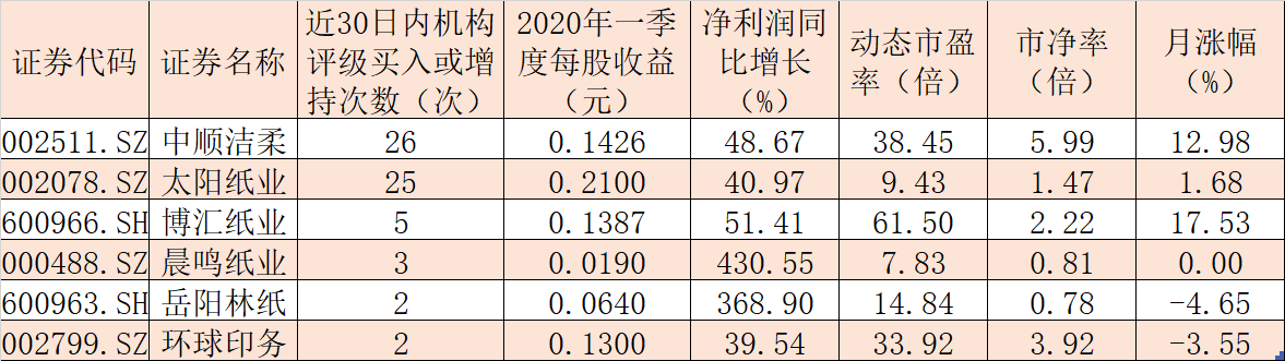 在紙價(jià)上漲的支撐下,部分績優(yōu)股受到機(jī)構(gòu)的關(guān)注。統(tǒng)計(jì)顯示,在上述15只一季度凈利潤實(shí)現(xiàn)增長的個(gè)股中,中順潔柔(26次)、太陽紙業(yè)(25次)、博匯紙業(yè)(5次)、晨鳴紙業(yè)(3次)、岳陽林紙(2次)和環(huán)球印務(wù)(2次)等6只績優(yōu)股近30日內(nèi)獲得機(jī)構(gòu)給予“買入”或“增持”等看好評(píng)級(jí),后市配置機(jī)會(huì)凸顯。