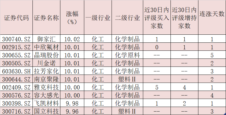 《證券日?qǐng)?bào)》記者根據(jù)同花順數(shù)據(jù)統(tǒng)計(jì)發(fā)現(xiàn),截至5月19日收盤(pán),化工板塊漲幅達(dá)1.61%,位居28類(lèi)申萬(wàn)一級(jí)行業(yè)漲幅榜前列。板塊內(nèi),御家匯、中欣氟材、晶瑞股份、川金諾、拉芳家化、南京聚隆、雅克科技、容大感光、飛凱材料、國(guó)立科技等10只化工股均收獲漲停。