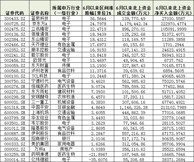 外資的涌入無疑對股價形成良好的支撐。統(tǒng)計(jì)發(fā)現(xiàn),在上述28只獲得北上資金凈買入的個股中,6月以來,有22只個股跑贏同期上證指數(shù)。其中,藍(lán)思科技、京東方A和立訊精密等3只電子股月內(nèi)累計(jì)漲幅均超20%,分別為36.56%、24.8%和22.5%,盡顯強(qiáng)勢。