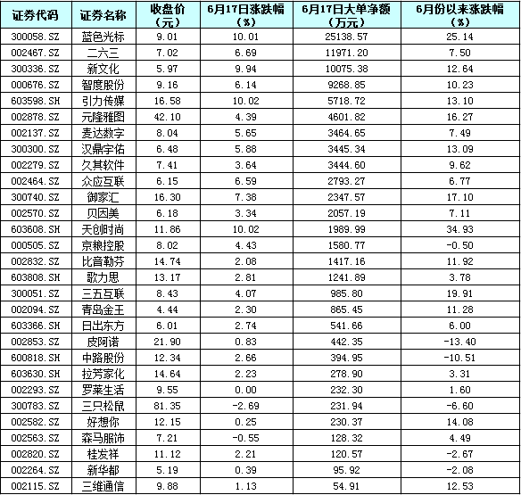 除機(jī)構(gòu)長期看好網(wǎng)紅經(jīng)濟(jì)概念股機(jī)會(huì)外,短線資金也對網(wǎng)紅經(jīng)濟(jì)概念股青睞有加。6月17日,共有29只網(wǎng)紅經(jīng)濟(jì)概念股呈現(xiàn)大單資金凈流入態(tài)勢,合計(jì)大單資金凈流入9.52億元。其中,16只概念股大單資金凈流入超1000萬元,藍(lán)色光標(biāo)、二六三、新文化等3只概念股大單資金凈流入均在1億元以上,分別為25138.57萬元、11971.20萬元、10075.38萬元,此外,智度股份和引力傳媒大單資金凈流入也均超5000萬元,上述5只個(gè)股合計(jì)吸金6.22億元。