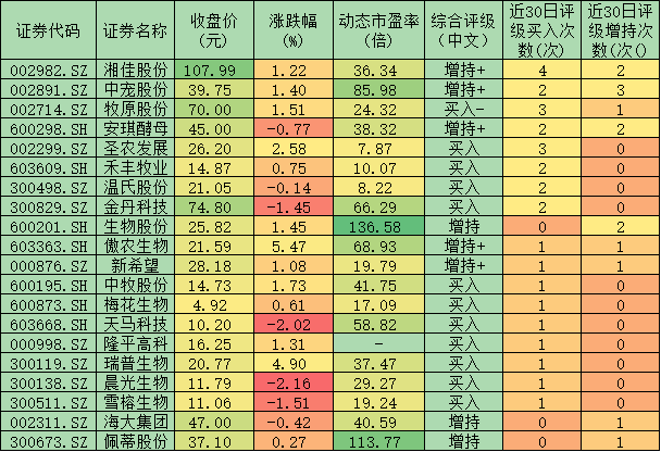 從機(jī)構(gòu)評級來看,近30日內(nèi)有20家農(nóng)林牧漁行業(yè)公司獲得評級機(jī)構(gòu)的43次推薦類評級,其中,湘佳股份獲得機(jī)構(gòu)4次買入評級和2次增持評級,此外,包括中寵股份、牧原股份、安琪酵母等在內(nèi)的7只個股獲得機(jī)構(gòu)2次以上推薦評級。
