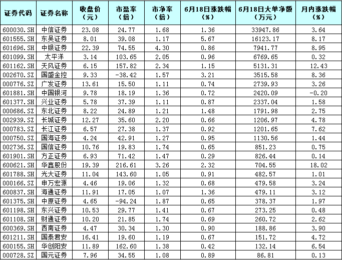 與此同時(shí),手握真金白銀的買方也頗為看好券商板塊。僅6月18日一天就有9.16億元大單資金搶籌26只券商股,其中,中信證券、東吳證券等兩只個(gè)股大單資金凈流入均超1億元,分別為33947.86萬元、16123.17萬元,此外,中銀證券、太平洋、天風(fēng)證券等個(gè)股大單資金凈流入也均在5000萬元以上。