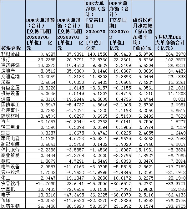 各路資金展開了調(diào)倉換股。7月以來的4個交易日中,市場呈現(xiàn)出資金凈流入態(tài)勢。從申萬一級行業(yè)來看,非銀金融和銀行等兩行業(yè)期間資金凈流入均超百億元,分別為264.6億元和102.9億元,合計達367.5億元,成為資金追捧的重點領(lǐng)域。而此前漲幅居前的醫(yī)藥生物行業(yè)期間累計資金凈流出達193.9億元。