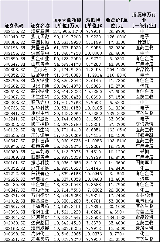 從個(gè)股來(lái)看,周一,有1290只個(gè)股呈現(xiàn)出資金凈流入態(tài)勢(shì),占可交易個(gè)股總數(shù)的33.2%。其中,有345只個(gè)股資金凈流入超1000萬(wàn)元,合計(jì)凈流入資金達(dá)192.57億元。海康威視、紫光國(guó)微、中國(guó)長(zhǎng)城、復(fù)星醫(yī)藥、通富微電、紫金礦業(yè)等6只個(gè)股資金凈流入均超5億元,分別為13.49億元、9.01億元、6.35億元、6.15億元、5.13億元和5.04億元。