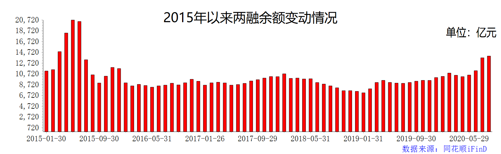 從歷史數(shù)據(jù)來看,去年12月份滬深兩市兩融余額再次突破1萬億元以后,始終在1萬億元至1.1萬億元間徘徊,直至2020年8月6日,兩融余額迅速攀升至1.47萬億元,創(chuàng)出五年來新高。