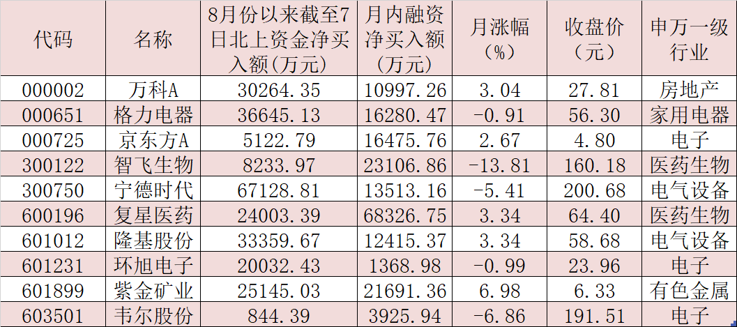 表:月內(nèi)實現(xiàn)北上資金青睞且受到融資客追捧的個股(時間:8月份以來截至8月7日)