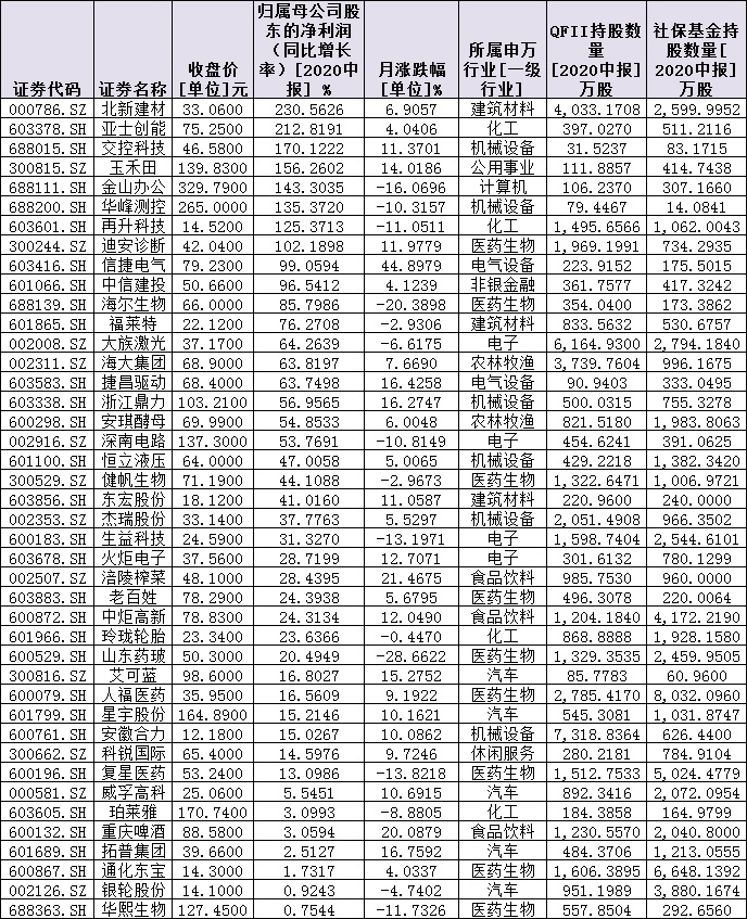 秉承長期投資、價值投資理念的社?;鸪謧}一直以來備受各方關(guān)注。在上述1110家凈利潤增長的公司中,截至今年上半年,包括順絡(luò)電子、湯臣倍健、利爾化學(xué)、廈門象嶼等在內(nèi)的197家公司的前十大流通股股東名單中有社?;瓞F(xiàn)身。另外,有106公司的前十大流通股股東名單中有QFII現(xiàn)身。進(jìn)一步梳理發(fā)現(xiàn),有43家公司同時被社保基金和QFII持有,成為兩大機(jī)構(gòu)共同追捧的對象。