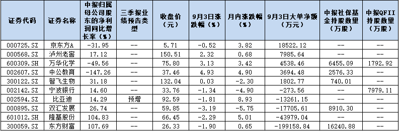 可以看到,除北上資金外,場內短線資金也對上述個股較為關注,9月3日,有5只個股呈現(xiàn)大單資金凈流入狀態(tài),合計吸金3.65億元,在資金的助力下,上述5只個股當日股價表現(xiàn)全部跑贏大盤(滬指跌幅0.58%),其中,中公教育、萬華化學、瀘州老窖等個股漲幅更是超過2%。