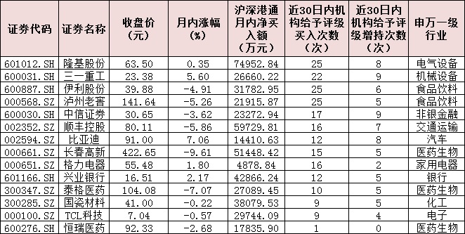 北上資金青睞的個(gè)股,不但受到各方的關(guān)注,同時(shí)也成為各大機(jī)構(gòu)研究的主要對象。統(tǒng)計(jì)顯示,上述14只個(gè)股,近30日內(nèi),全部被機(jī)構(gòu)給予“買入”或“增持”以上評級。其中,隆基股份、三一重工、伊利股份、瀘州老窖、中信證券、順豐控股、比亞迪、長春高新等8家公司被推薦次數(shù)均超過20次以上,后市值得關(guān)注。