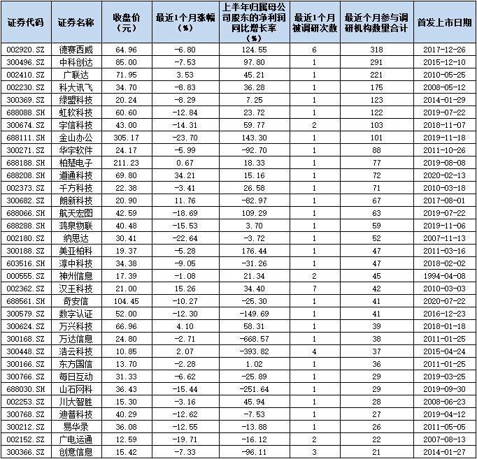 表:最近1個(gè)參與調(diào)研機(jī)構(gòu)在20家以上的計(jì)算機(jī)公司一覽