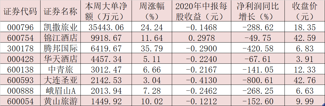 表:本周大單資金凈流入超過1000萬元的旅游酒店股