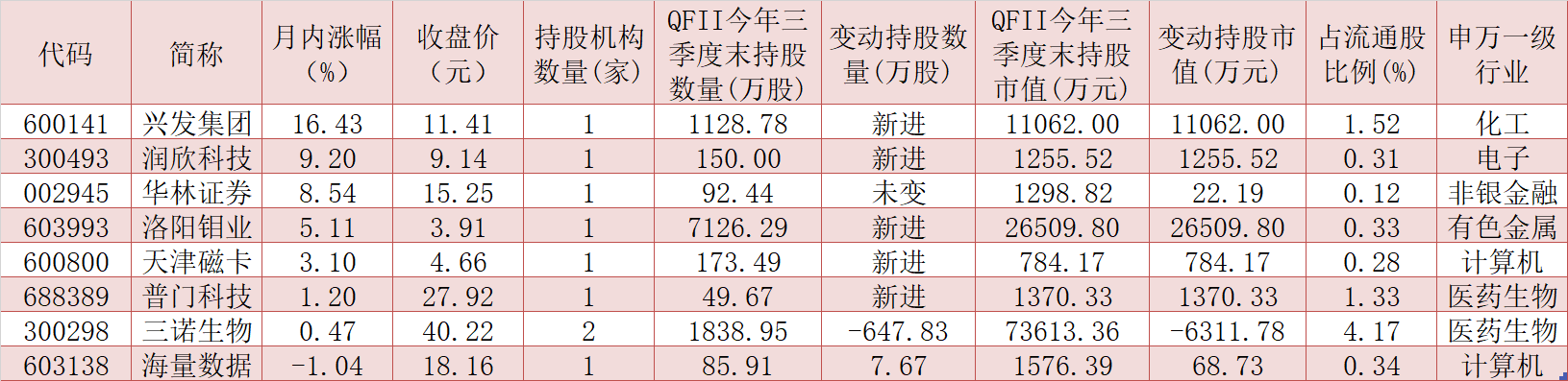 正因如此,QFII重倉股10月份以來股價表現良好,有7只個股月內股價實現上漲,占比近九成。其中,興發(fā)集團、潤欣科技、華林證券和洛陽鉬業(yè)等4只個股期間累計漲幅均超過5%。