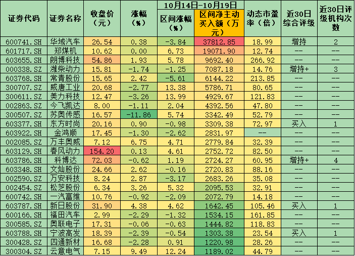 表:10月14日以來(lái)汽車(chē)板塊累計(jì)凈主動(dòng)買(mǎi)入超1000萬(wàn)元股一覽