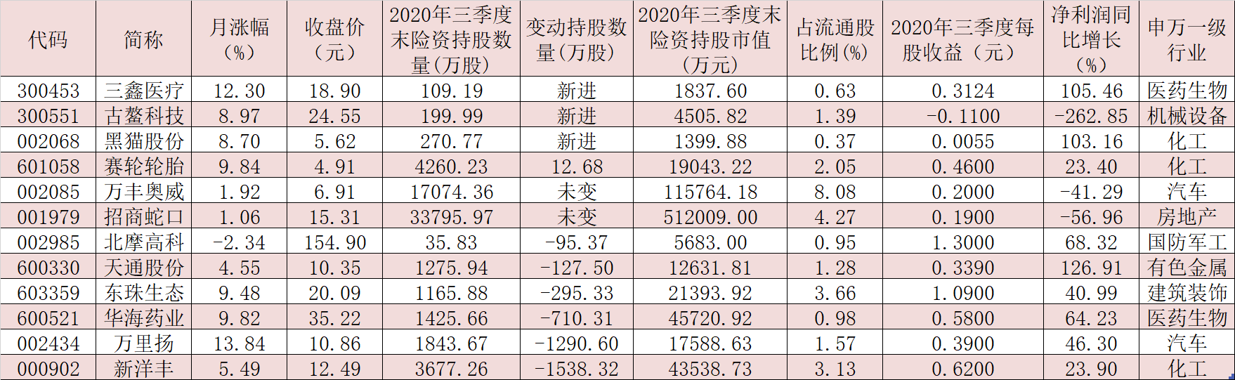 險資重倉股10月份以來股價表現(xiàn)良好,上述12只個股中,有11只個股月內(nèi)股價實現(xiàn)上漲,占比逾九成。其中,萬里揚、三鑫醫(yī)療、賽輪輪胎、華海藥業(yè)、東珠生態(tài)、古鰲科技、黑貓股份和新洋豐等8只個股期間累計漲幅均超過5%。