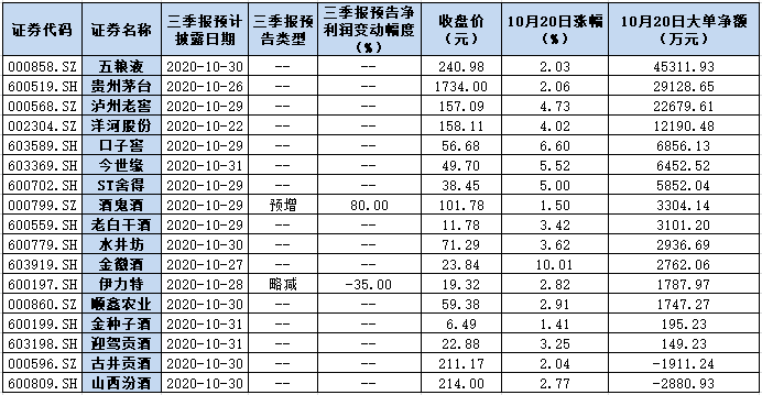 可以看到,嗅覺敏銳的大單資金也開始積極布局。10月20日,白酒板塊大單資金凈流入13.97億元。其中,16只個股獲大單資金青睞,五糧液、貴州茅臺、瀘州老窖、洋河股份等4只個股大單資金凈流入均超億元,分別為4.53億元、2.91億元、2.27億元、1.22億元,而這4只個股合計吸金就達10.93億元。