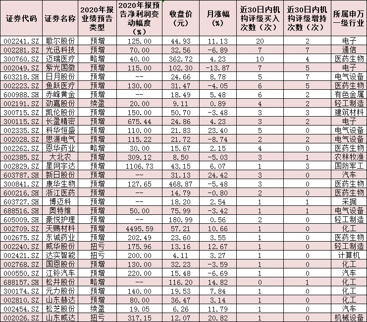 出色的表現(xiàn)無(wú)疑受到機(jī)構(gòu)的高度關(guān)注。統(tǒng)計(jì)顯示,在93只年報(bào)預(yù)喜股中,機(jī)構(gòu)近30日內(nèi)給予“買入”或“增持”以上評(píng)級(jí)的公司達(dá)32家,其中,歌爾股份、光迅科技、邁瑞醫(yī)療、紫光國(guó)微、日月股份、魚躍醫(yī)療、赤峰黃金、勁嘉股份、凱倫股份、長(zhǎng)盈精密、科華恒盛等11家公司,被推薦次數(shù)均超過(guò)5次及以上。