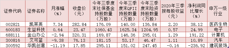 三季報披露臨近尾聲,機(jī)構(gòu)持倉逐漸浮出水面,尤其是社保基金、QFII、險資等三類機(jī)構(gòu)抱團(tuán)持倉的品種備受市場關(guān)注。對于投資者來說,跟隨機(jī)構(gòu)投資路線有助于把握當(dāng)前震蕩市下個股分化行情。《證券日報》記者根據(jù)同花順數(shù)據(jù)統(tǒng)計(jì)發(fā)現(xiàn),在已披露2020年三季報業(yè)績的上市公司中,凱萊英、生益科技、金山辦公、艾可藍(lán)、華凱創(chuàng)意等5家上市公司的前十大流通股股東名單中同時出現(xiàn)了社?;稹FII、險資的身影,合計(jì)持股市值為44.93億元。