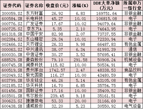 表:周一大單資金凈流入居前的個(gè)股情況: