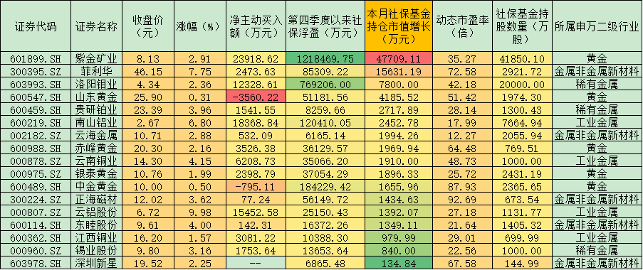 資金的流入增加了市場人氣也為部分長線資金帶來了較高浮盈。從社保基金持股的浮盈來看,假設(shè)社?;鹑径饶┮詠斫刂?1月9日持股數(shù)量未發(fā)生變化,其目前共持有紫金礦業(yè)、菲利華、洛陽鉬業(yè)等17只個股,以最新收盤價計算,其持股市值較三季度末增長12.10億元。如果單看11月份以來社?;鸪謧}有色金屬股的市值變化情況,則有9.61億元的賬面浮盈。