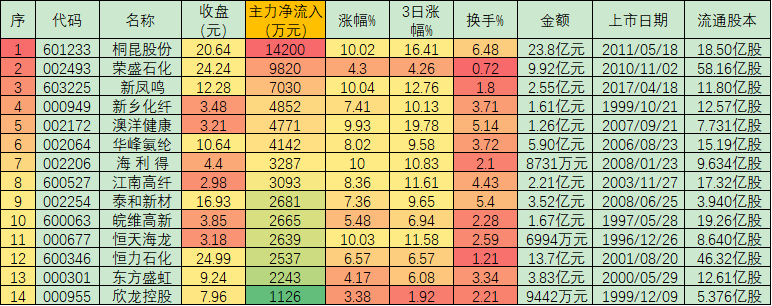 表:周一大單凈流入超1000萬(wàn)元化纖股市場(chǎng)表現(xiàn)一覽