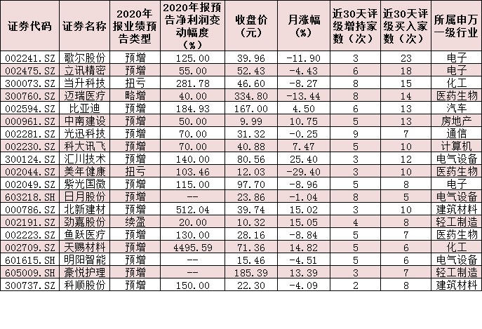 在走勢分化中,部分業(yè)績出色的公司受到機(jī)構(gòu)的高度關(guān)注。統(tǒng)計顯示,在上述年報預(yù)喜股中,機(jī)構(gòu)近30日內(nèi)給予“買入”或“增持”以上評級的公司達(dá)97家,其中,包括歌爾股份、立訊精密、當(dāng)升科技、邁瑞醫(yī)療、比亞迪、中南建設(shè)、光迅科技、匯川技術(shù)、科大訊飛等19家公司,被推薦次數(shù)均超過10次及以上,值得關(guān)注。