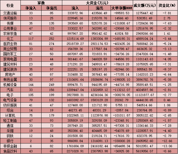 二、周一(12月7日)申萬(wàn)一級(jí)行業(yè)大單資金流向
