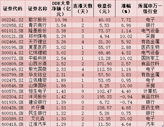 一、周三(12月9日)DDE大單資金凈買入TOP20