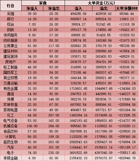 二、周三(12月9日)申萬(wàn)一級(jí)行業(yè)大單資金流向