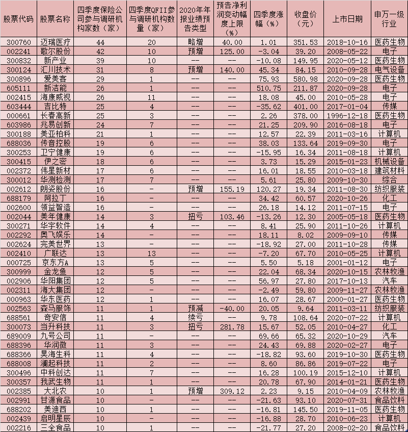 表:四季度獲10家及以上保險(xiǎn)公司扎堆調(diào)研的個(gè)股