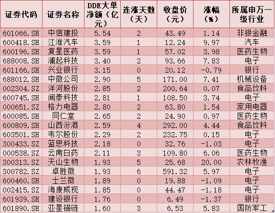 一、周五(12月11日)DDE大單資金凈買入TOP20
