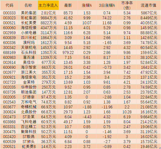 表:周二家電行業(yè)大單資金凈買入個股一覽